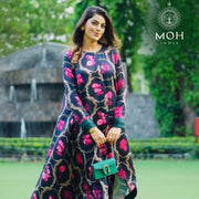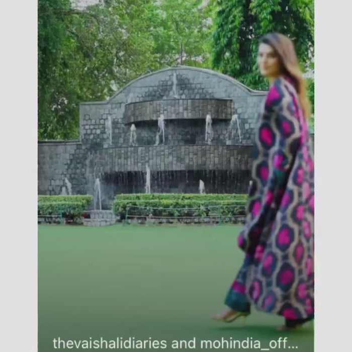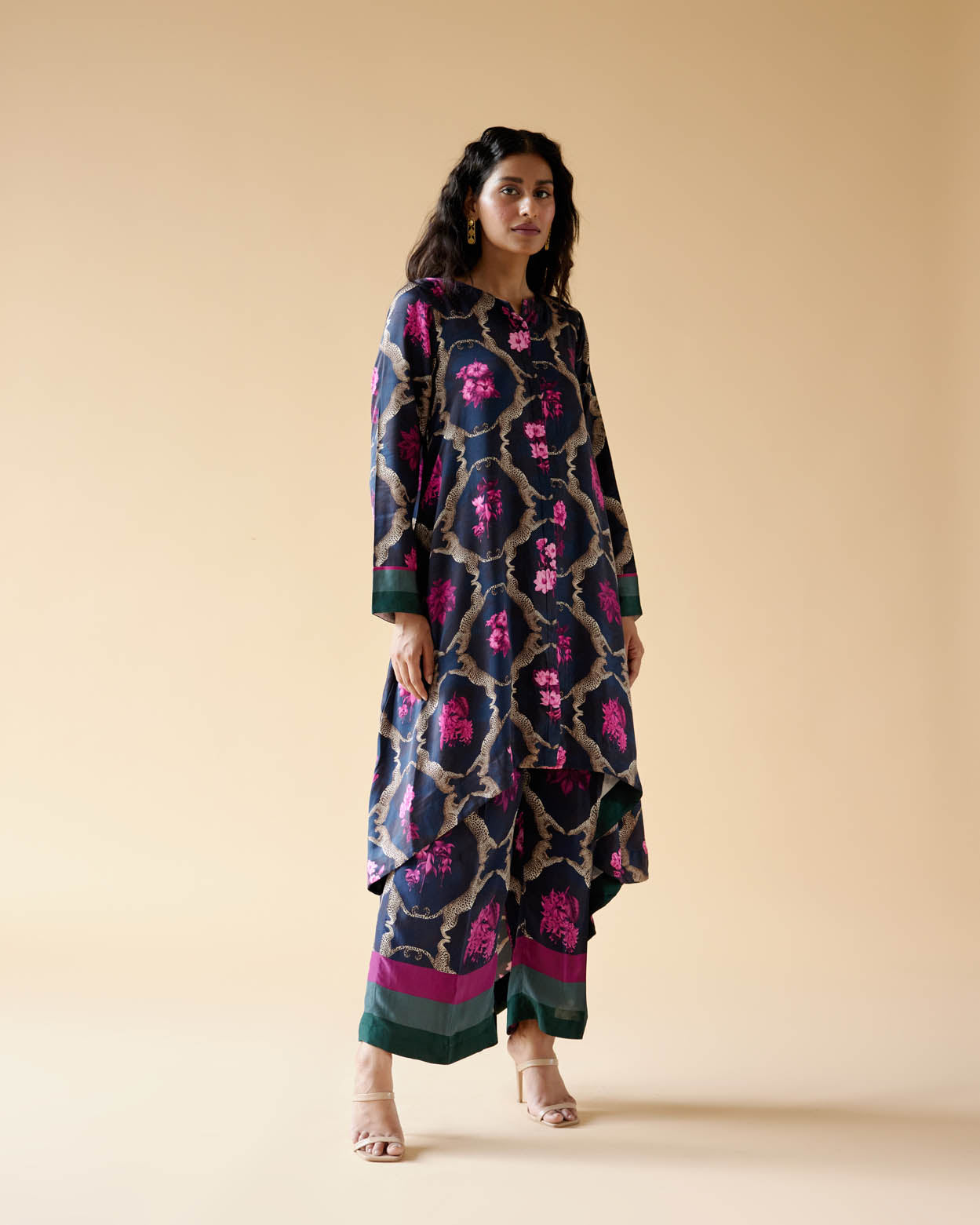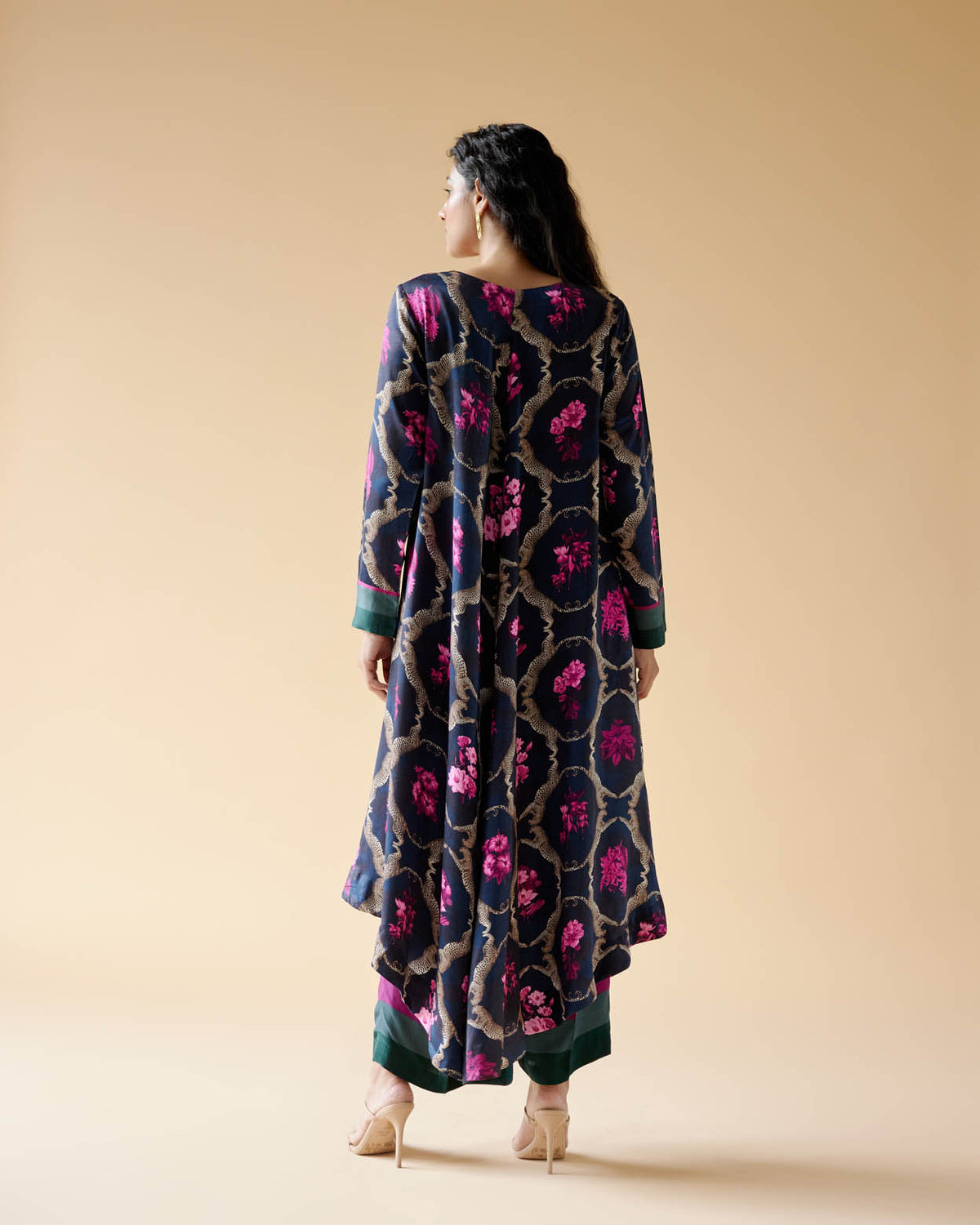 A different world awakens in the wee hours of the dark, a friendship blooms that is here to stay, like between these bunches of dahlia and midnight canvas on this eternally graceful kurta.
