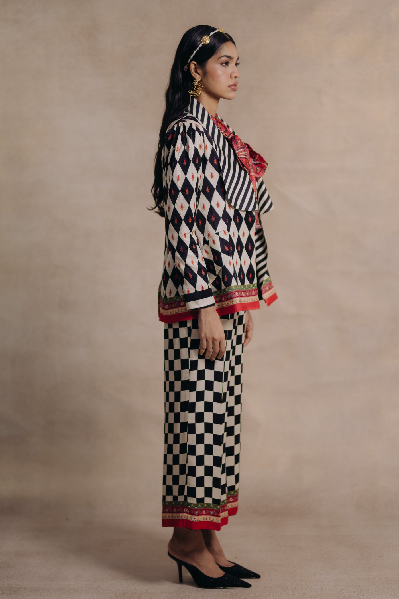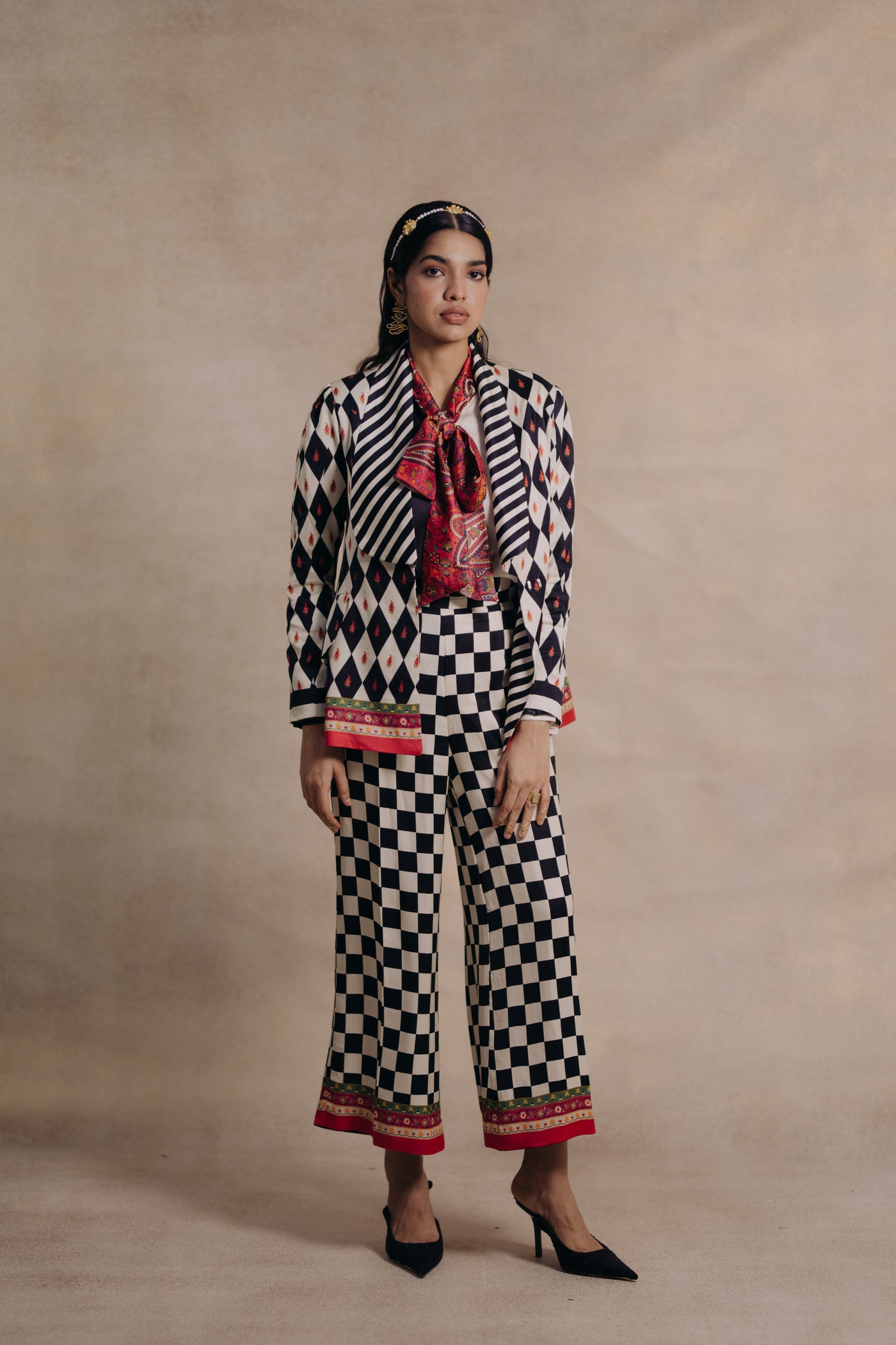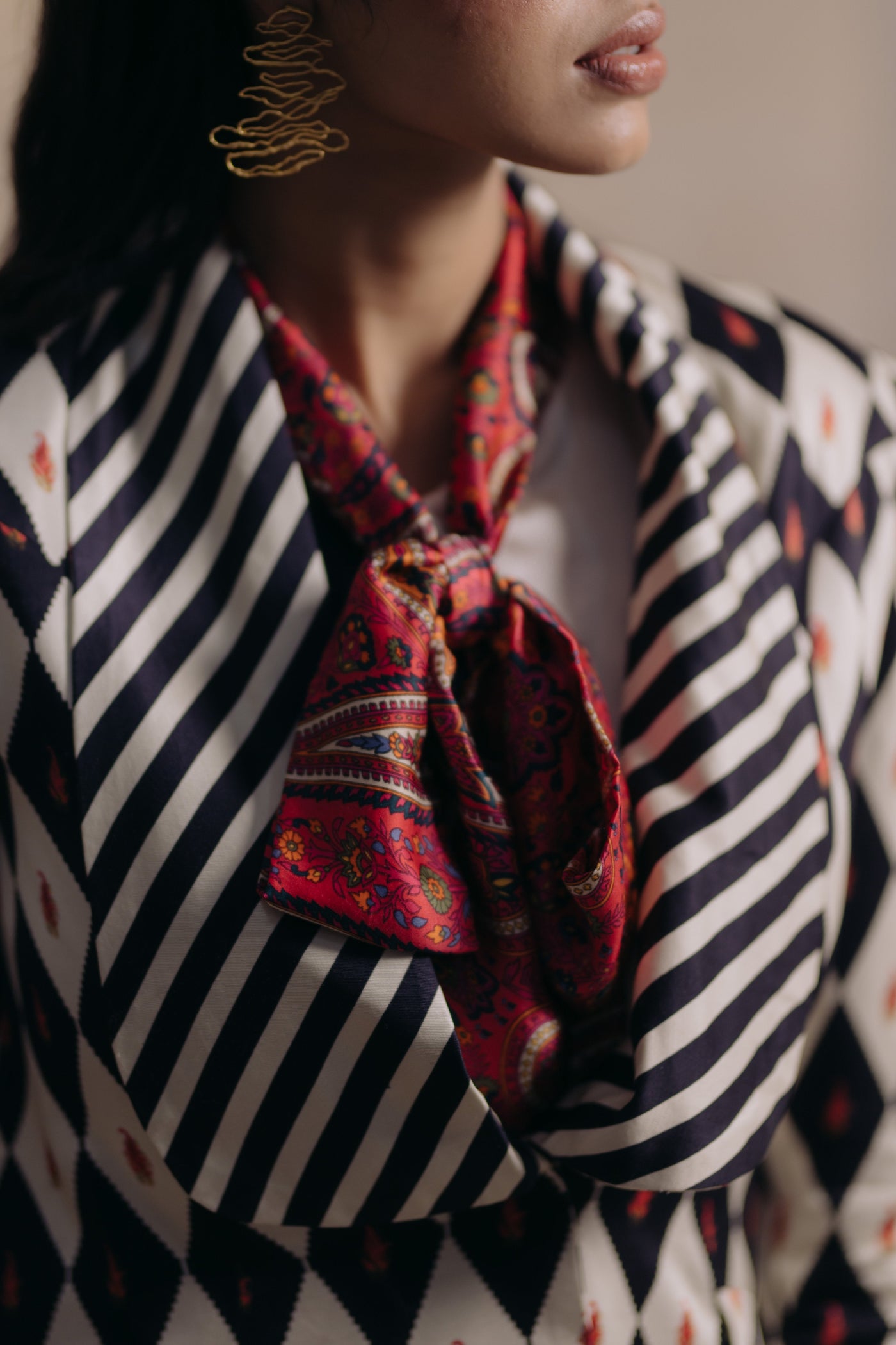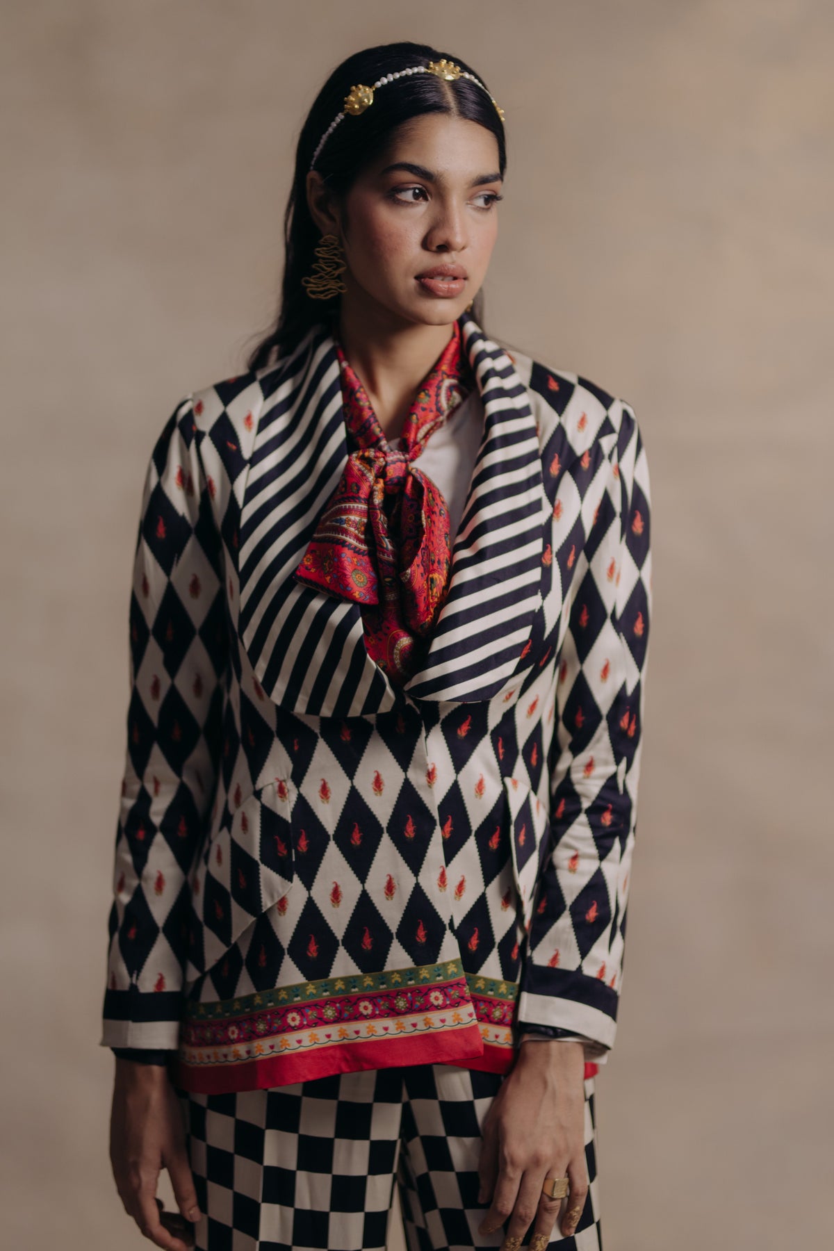A rare yet an absolute unmissable blend of the past and the present, the Jaal Blazer combines a checkered modern base with the hand-drawn paisley motif, over a neat, structured silhouette to elevate a wardrobe staple with couture-like detailing.