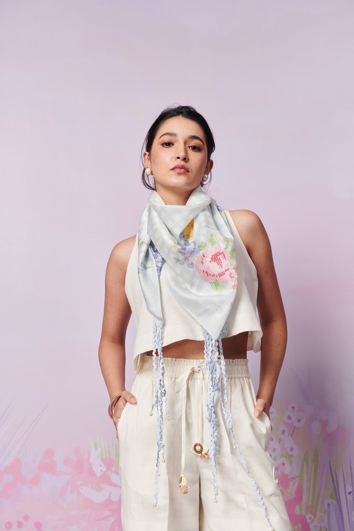 "Introducing the Capri Roses Scarf, a Chanderi silk masterpiece. Adorned with a charming blue gingham print and featuring a hanging lace design, each corner is delicately embellished with pearls. Elevate any outfit with this elegant accessory, a timeless addition to your wardrobe.