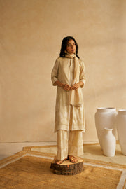 Soft, weightless, and rich in detail, this silk Chanderi scarf is designed for those who appreciate subtle grandeur. The lace-edged borders add an air of timeless romance, while the delicate shell tassels bring a raw, organic touch—a perfect balance of structure and softness. Whether styled with a flowing kurta or layered over contemporary silhouettes, this piece is a poetic blend of tradition and modern refinement.