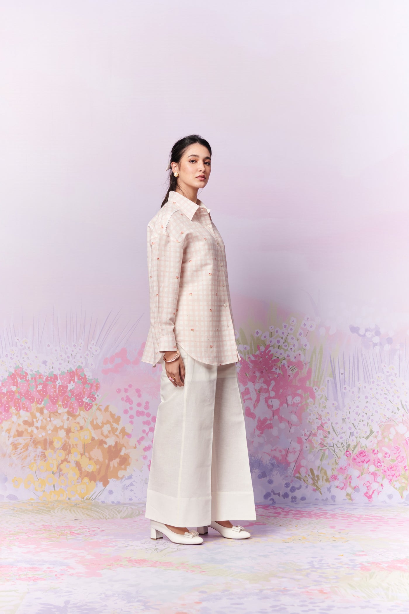 "Introducing the Blush Blossom Shirt and Trousers Co-ord Set in luxurious linen. Adorned with a charming pink check print, the shirt features front buttons for a stylish touch. Paired with matching trousers, this set offers timeless elegance and effortless sophistication for any occasion.