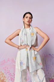 "Introducing the Capri Roses Stole, a luxurious Chanderi silk creation. Adorned with a captivating blue gingham print and embellished with hanging lace designs, each corner is delicately accented with pearls. Elevate any ensemble with a touch of elegance and sophistication. Material : 100% Pure Chanderi Silk Fit Type : Free size Care Instructions : Only dry clean you silks and prints. Give your cottons dry clean as a first cleanse. Do not iron at high temperatures. Refold regularly to let the textile breathe. Avoid spraying perfume in close contact with the fabric. Need Help? : ""Our team consists of ace stylists who are easily accessible to support you. You can reach out to us; we're eager to provide our assistance!