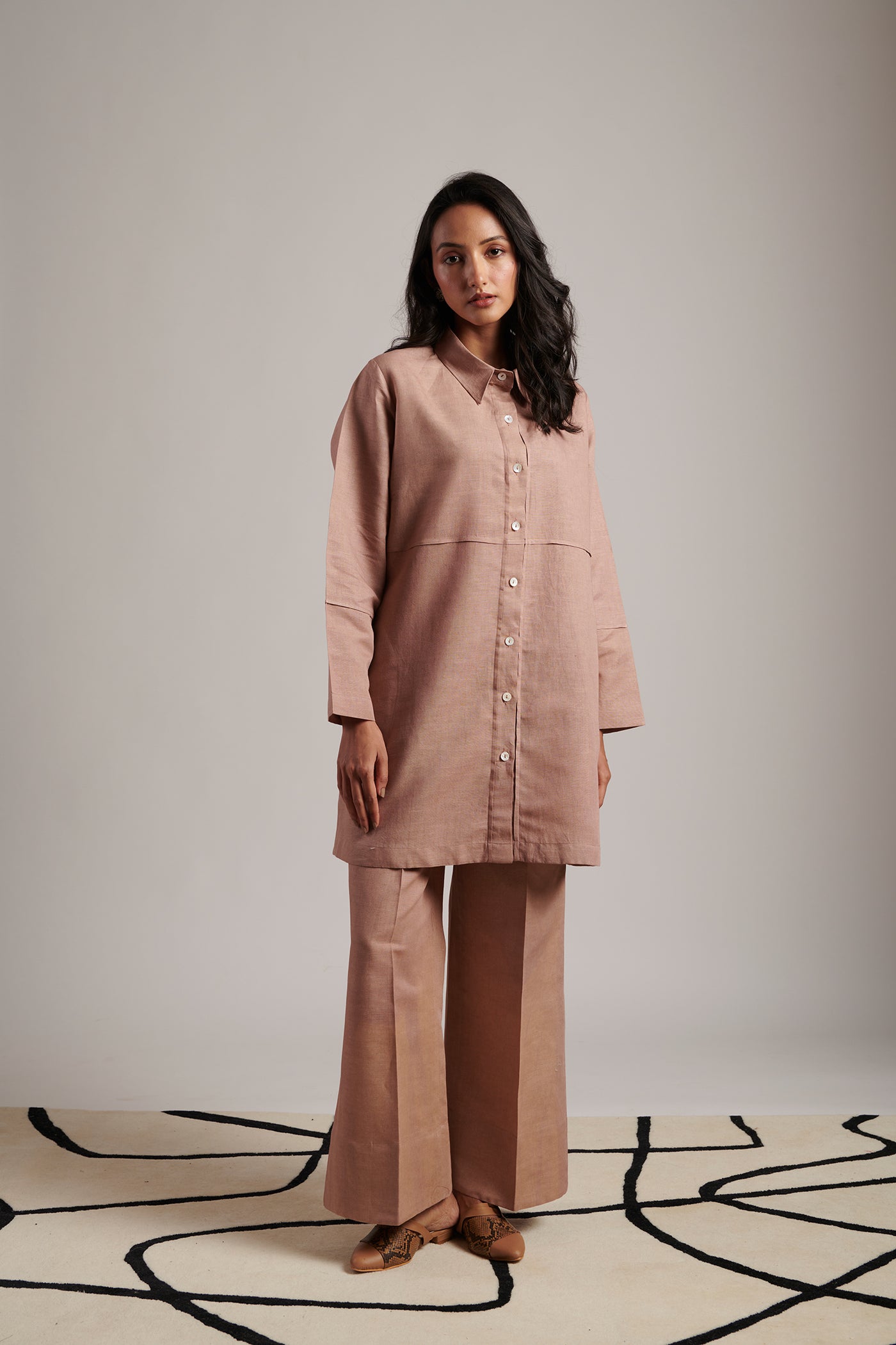 On days when you don’t feel like doing anything except putting your feet up on the couch or on days when you feel like you’re ready to conquer the world, you’ll find our Desire Co-ord Set as your emotional support in your corner. A daily staple that knows how to preserve itself for occasions, it comes with a minimal shirt tunic with front buttons paired with straight cut pants (lined up to knees with pure cotton muslin for comfort).