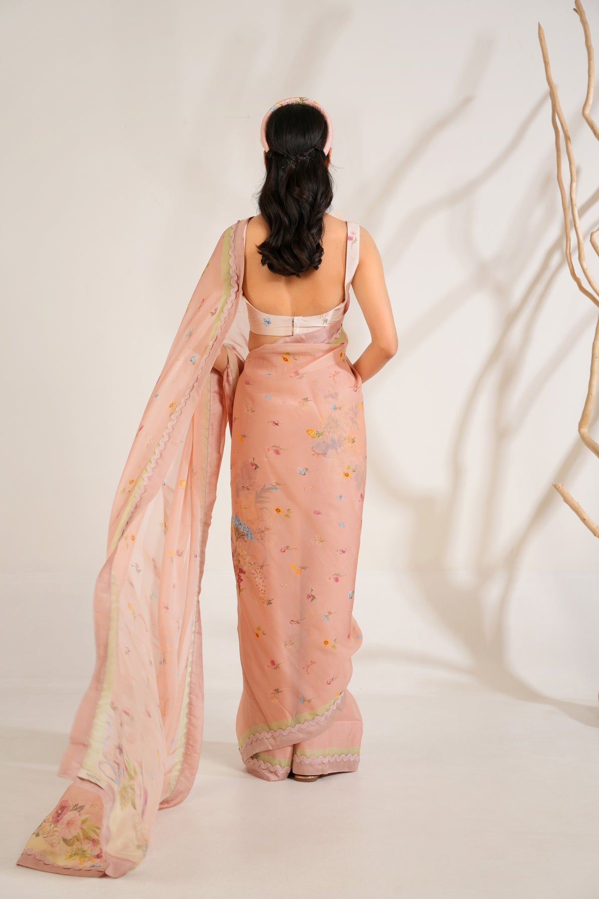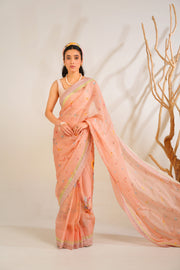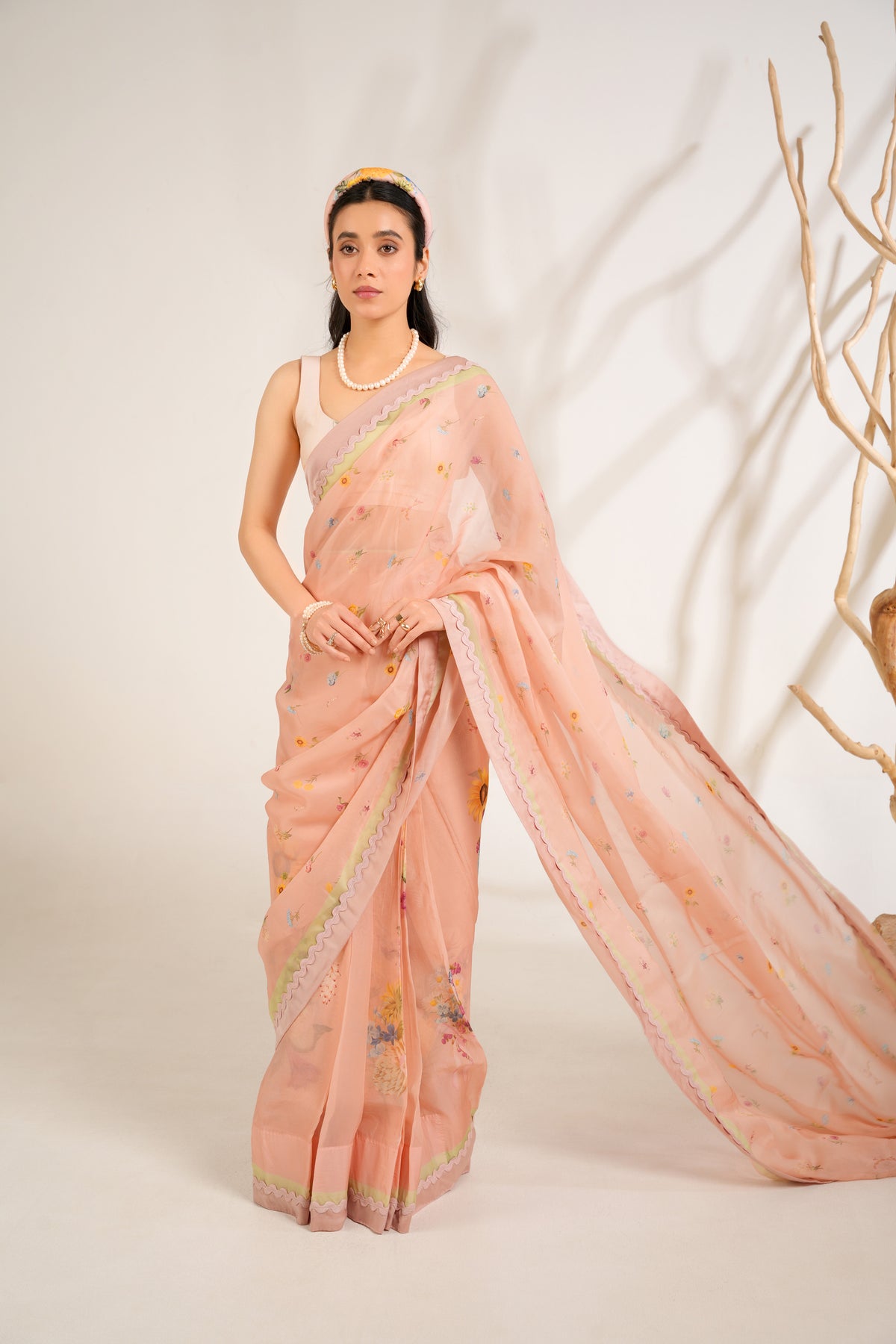 Crafted in ethereal organza, blush hues cradle airy floral bunches and ditsy motifs, capturing soft, romantic energy. The fabric’s supple drape ensures easy pleating, paired with a blush Chanderi blouse for a refined, effortless look.