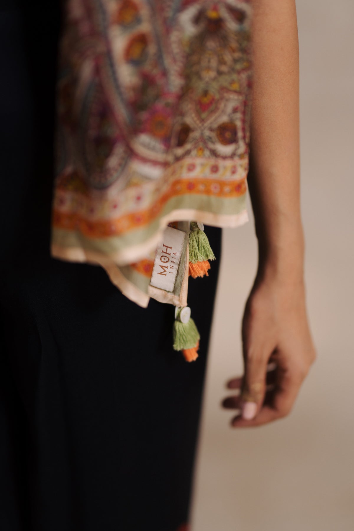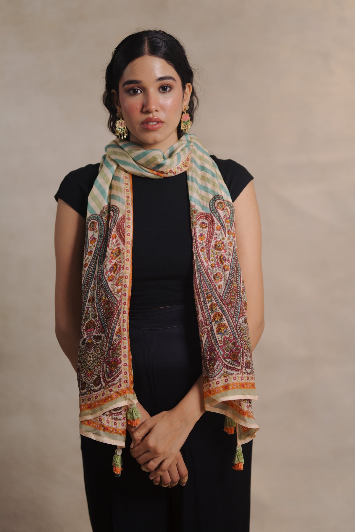 The Milan Stole is an amalgamation of the ornamental paisley with eccentric geometrical contrasts that come together to fit like pieces of a puzzle. Easy to amp up a staple with or just to add a sense of elan to any outfit, this piece truly speaks of trans-seasonal versatility.