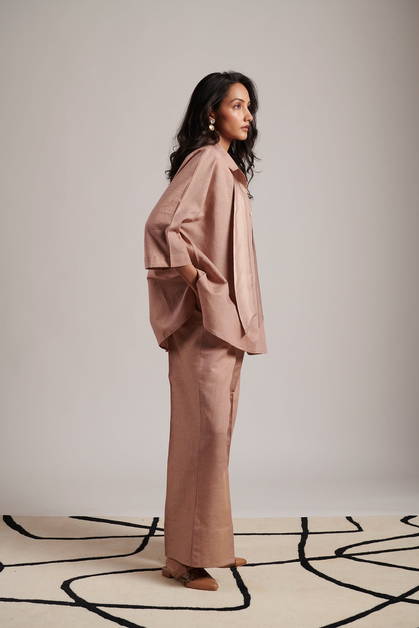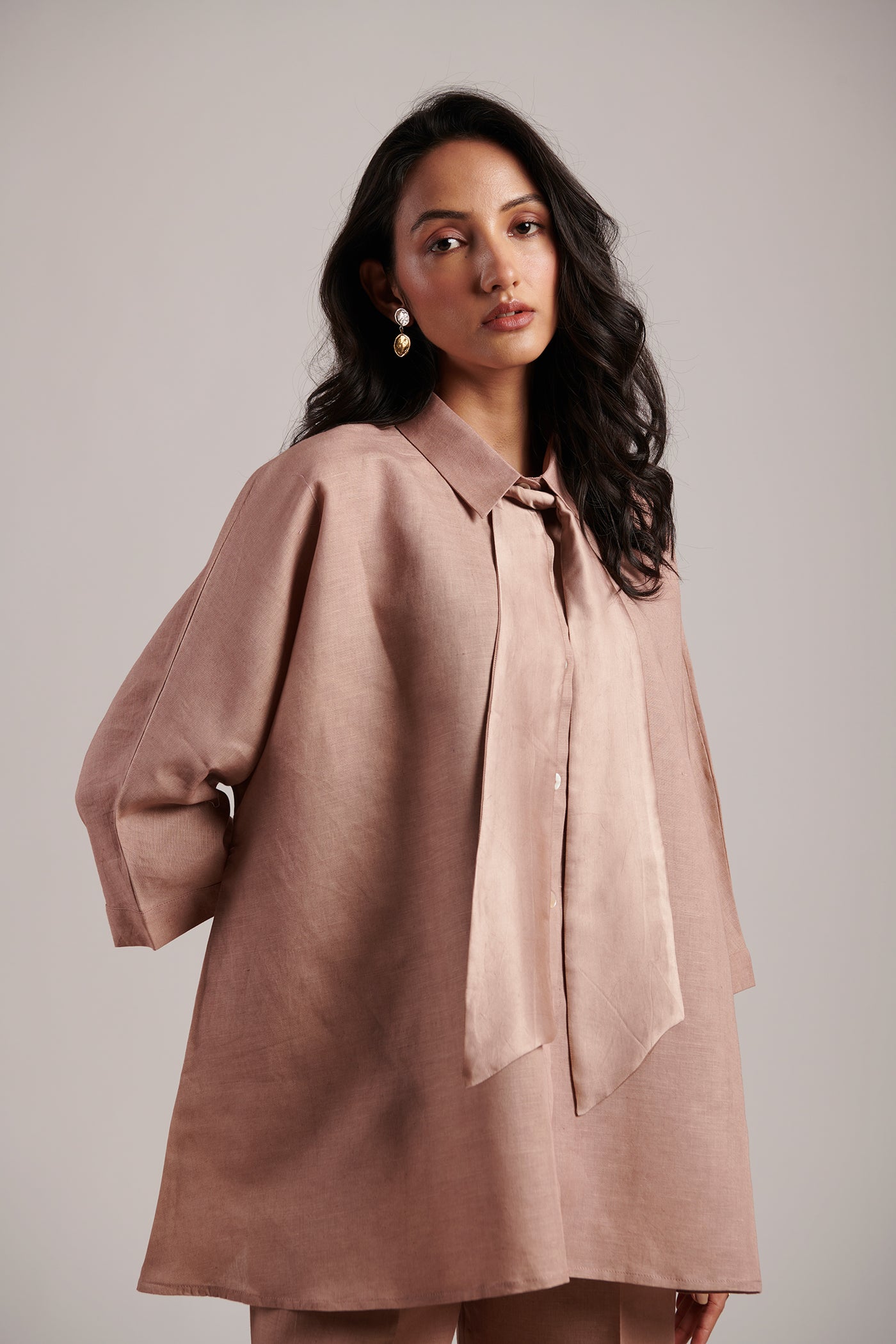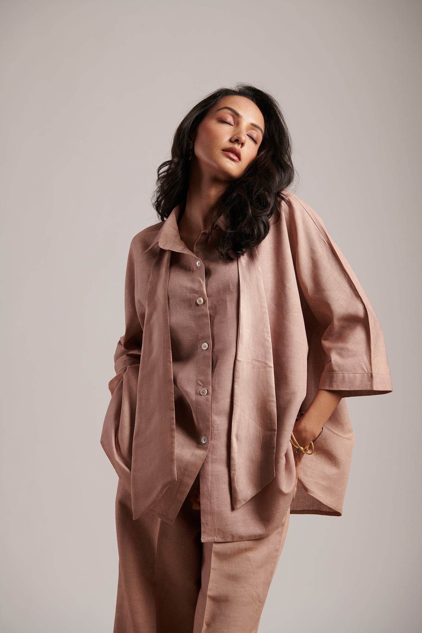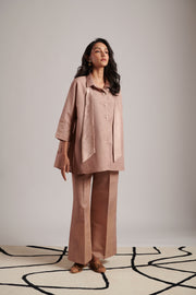 The Moon Co-ord Set is your perfect match when you have to be universally present, just in the right time. Easy to transition from AM to PM and from formal to casual settings, it comes with a shirt accompanied by a tie-up bow that can be worn as a mock scarf too over a pair of structured yet relaxed fit of trousers that are highly versatile (and effortless due to the inner pure cotton muslin half lining).