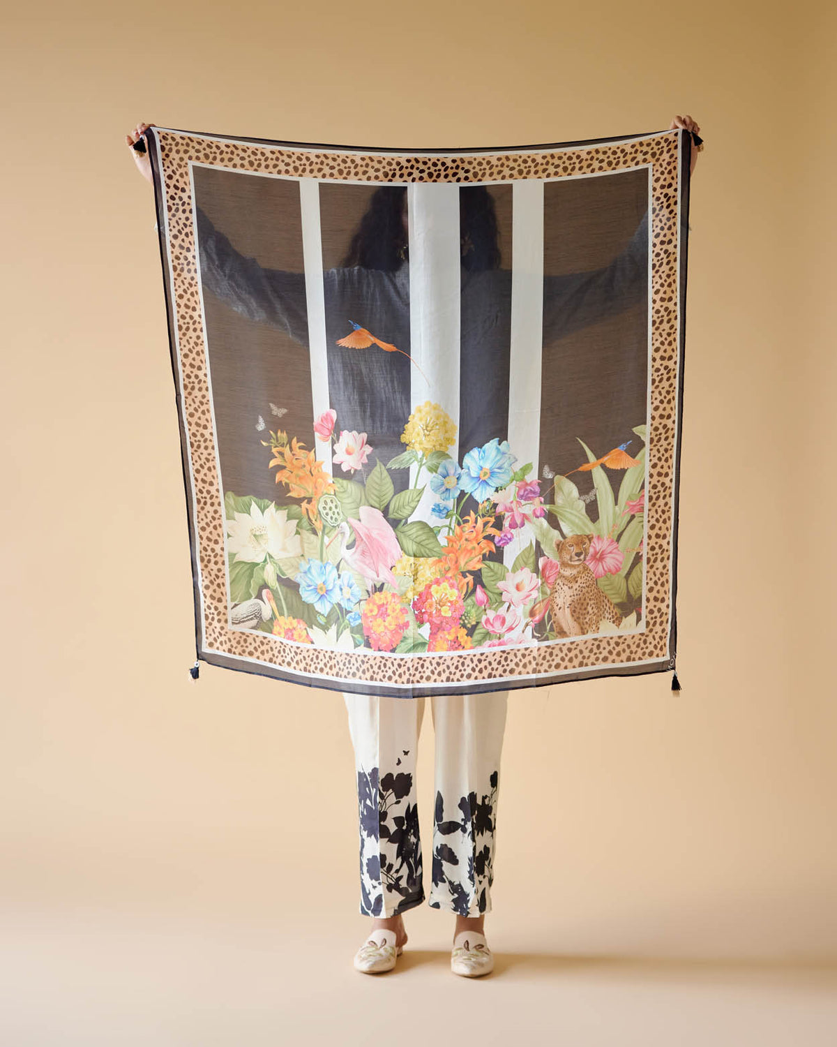 All the natives come together in a picturesque setting captured on this versatile-to-pair scarf, where each one makes space for another, where the true beauty lies in the diversity, resembling a night hour in the wild origins.
