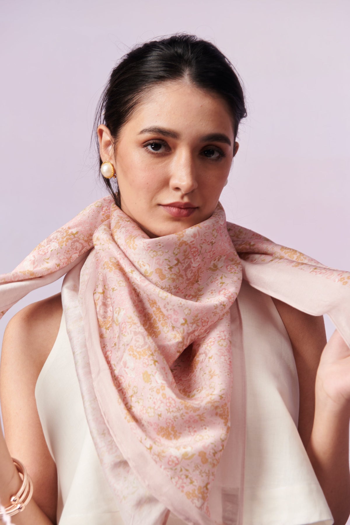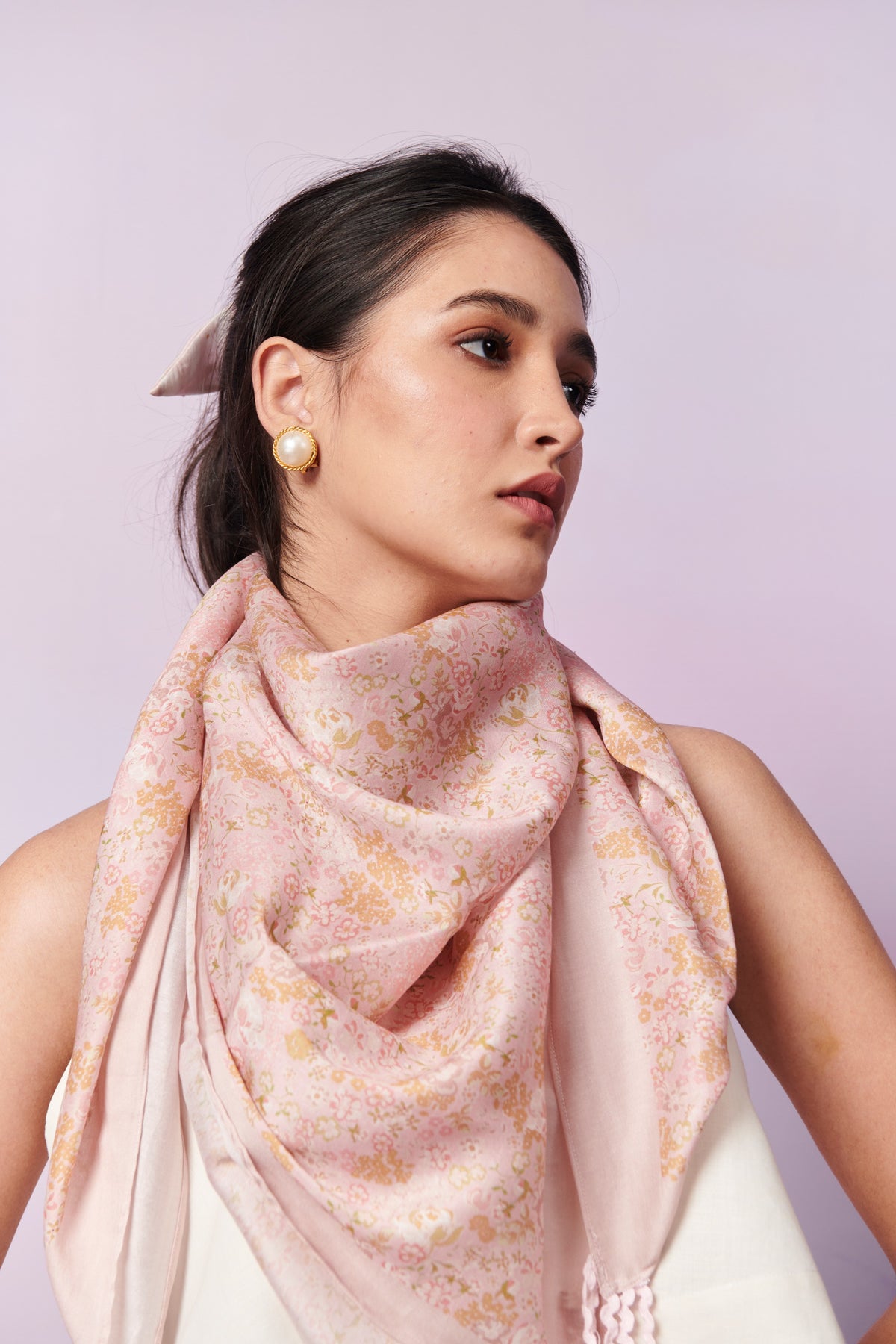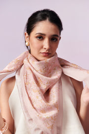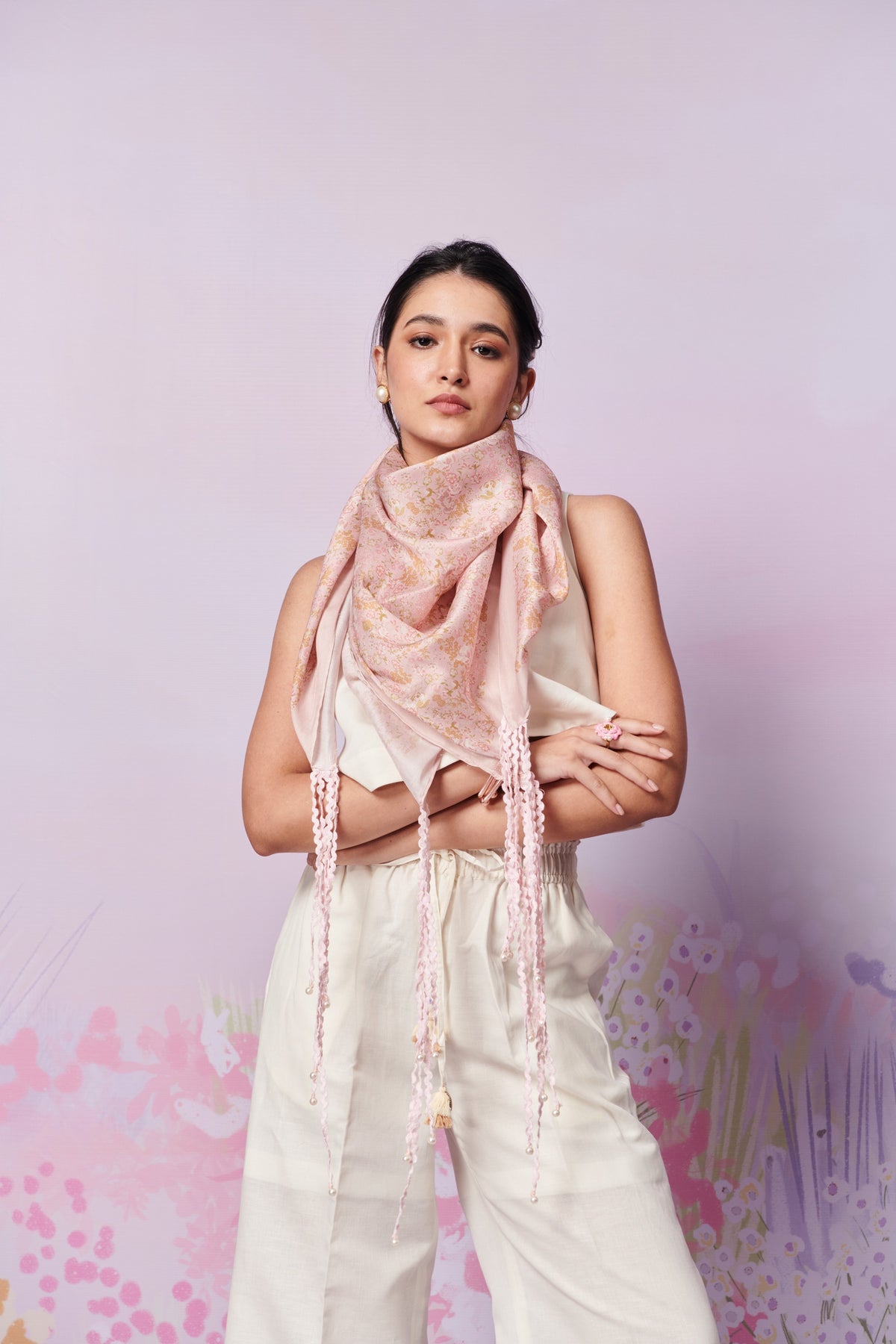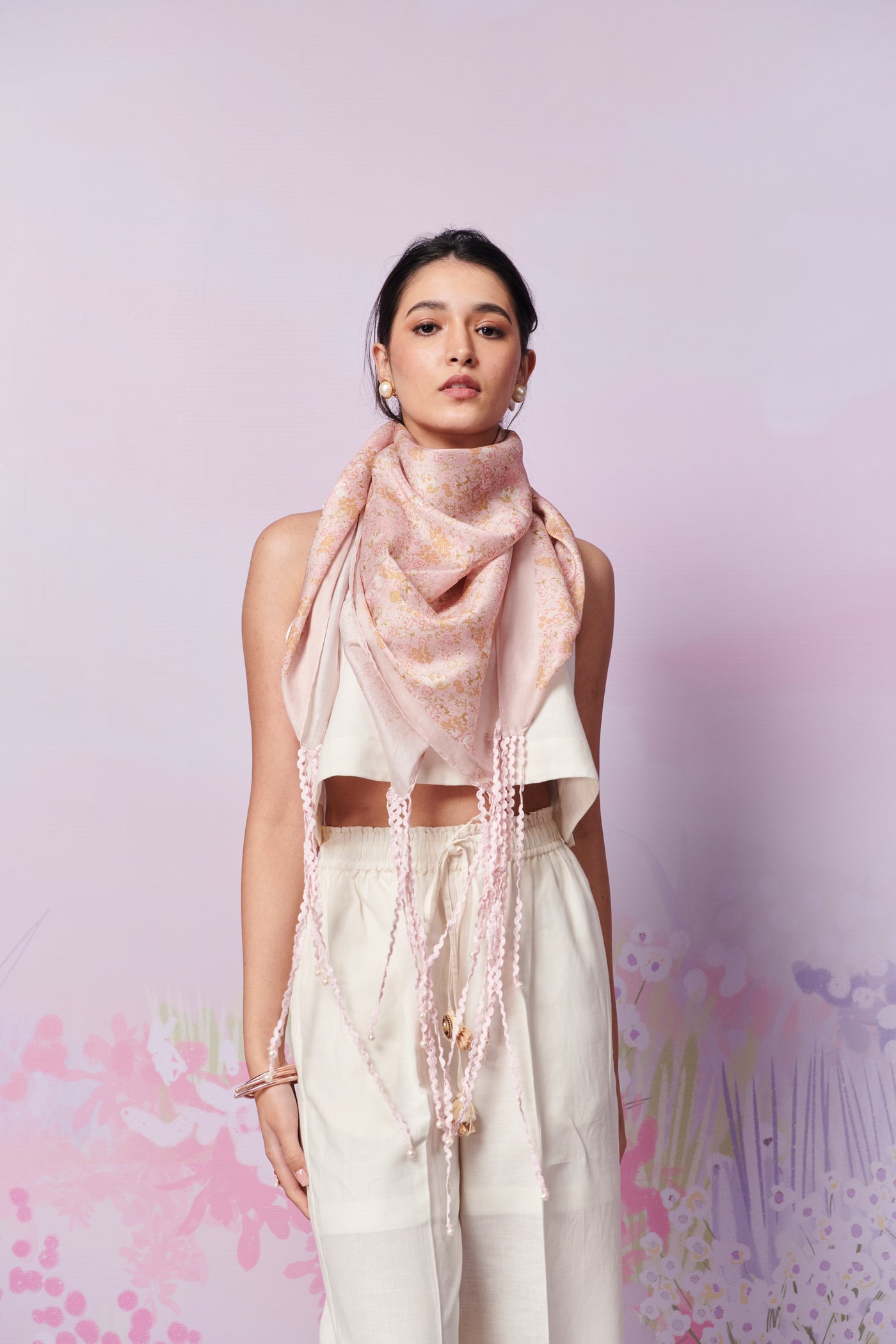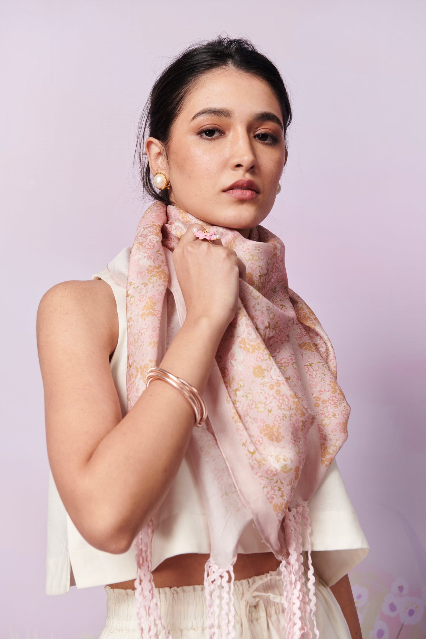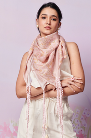 "Introducing the Petite Blooms Scarf, a luxurious adornment crafted from Chanderi silk. Adorned with a delicate pink ditsy print, its elegance is elevated by hanging lace delicately embellished with pearls on each corner. Embrace sophistication with every drape.