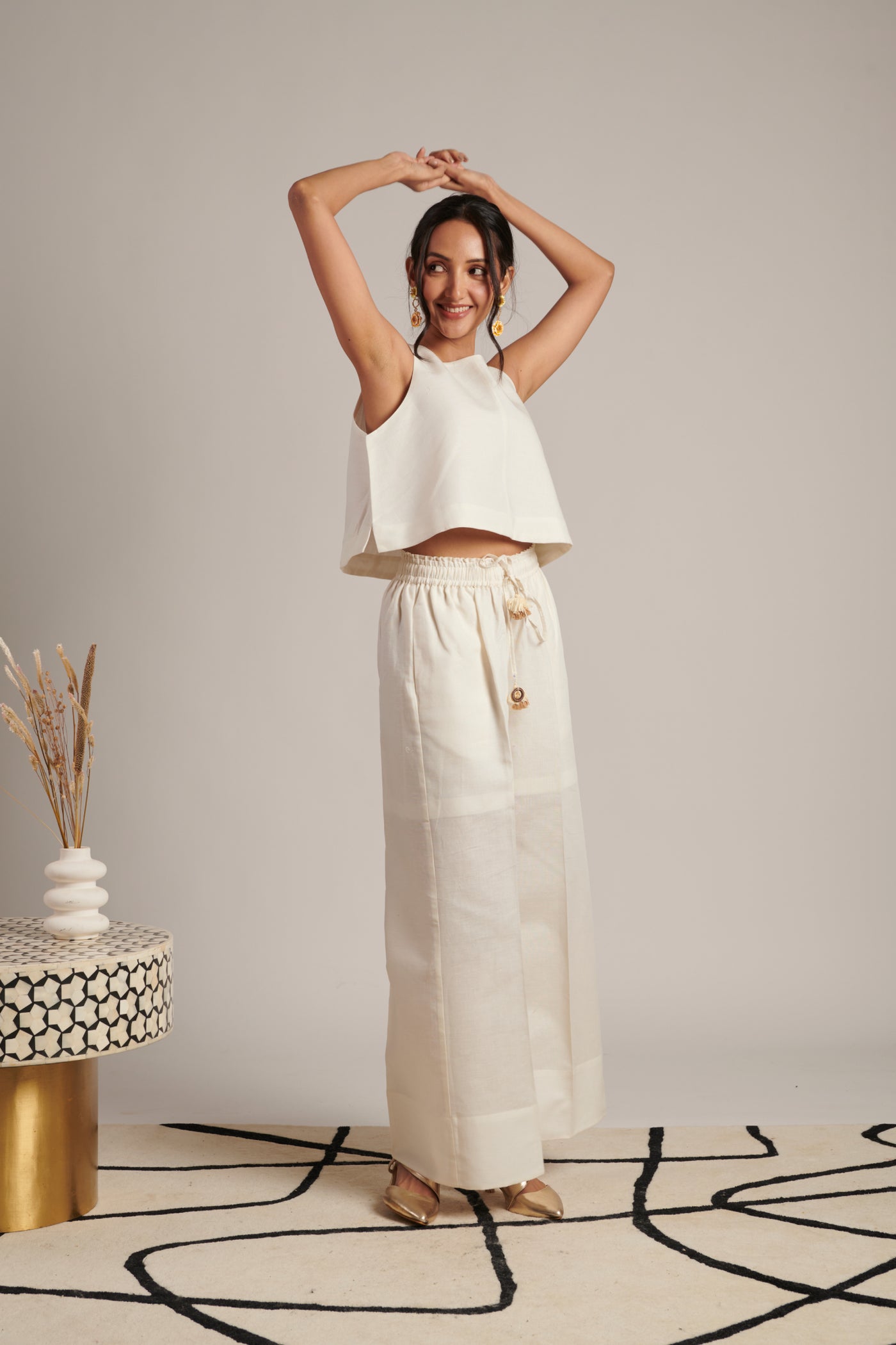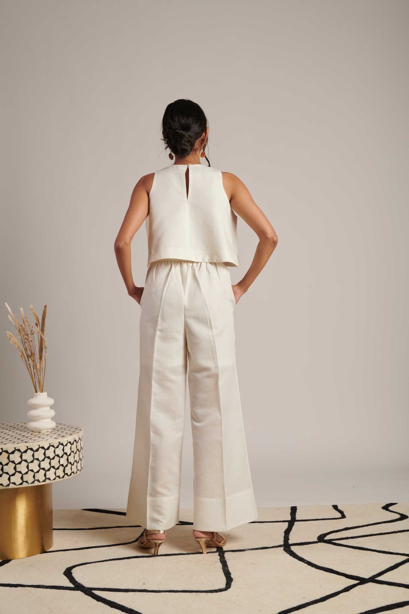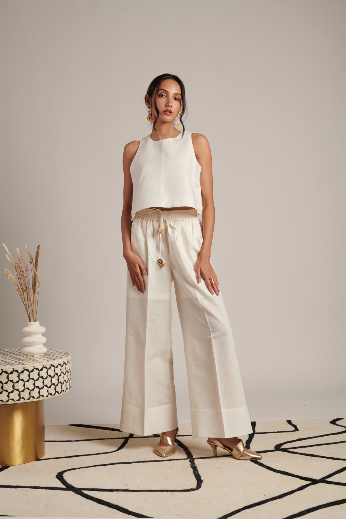 What happens when two absolute minimals come together as a pair? Our Ritual Co-ord Set personifies amplified minimalism for maximum impact no matter the occasion or season. The round necked modest sophistication of the crop top paired with an elegant tie-up trouser (that comes with a pure cotton muslin half lining) made in a straight yet breathable fit is perfect for day time around the city or to pack for lounging around during tropical holidays.