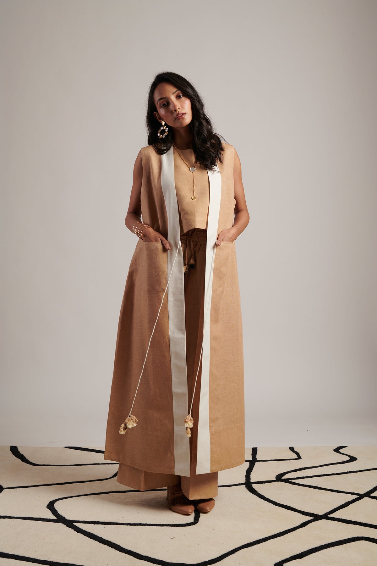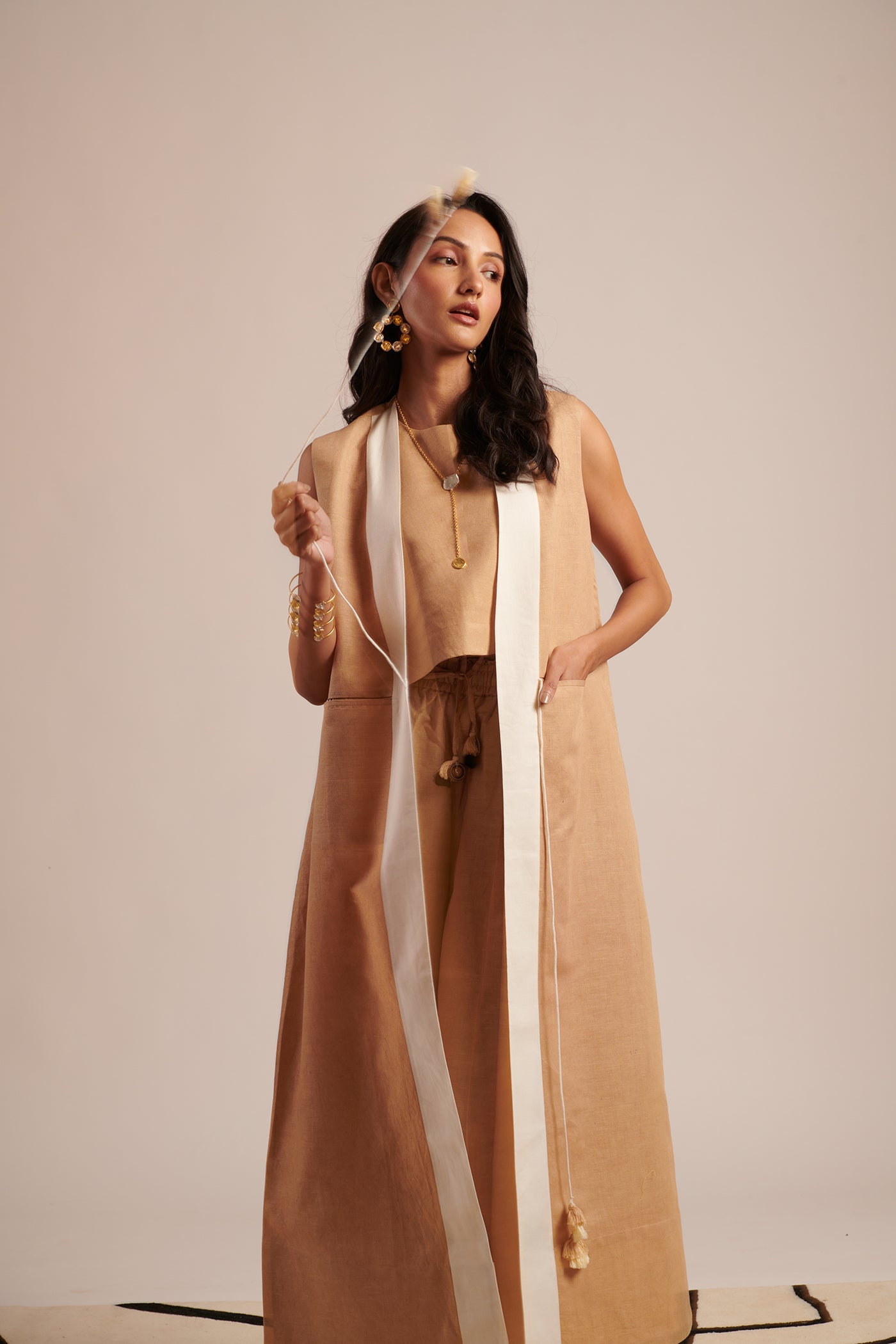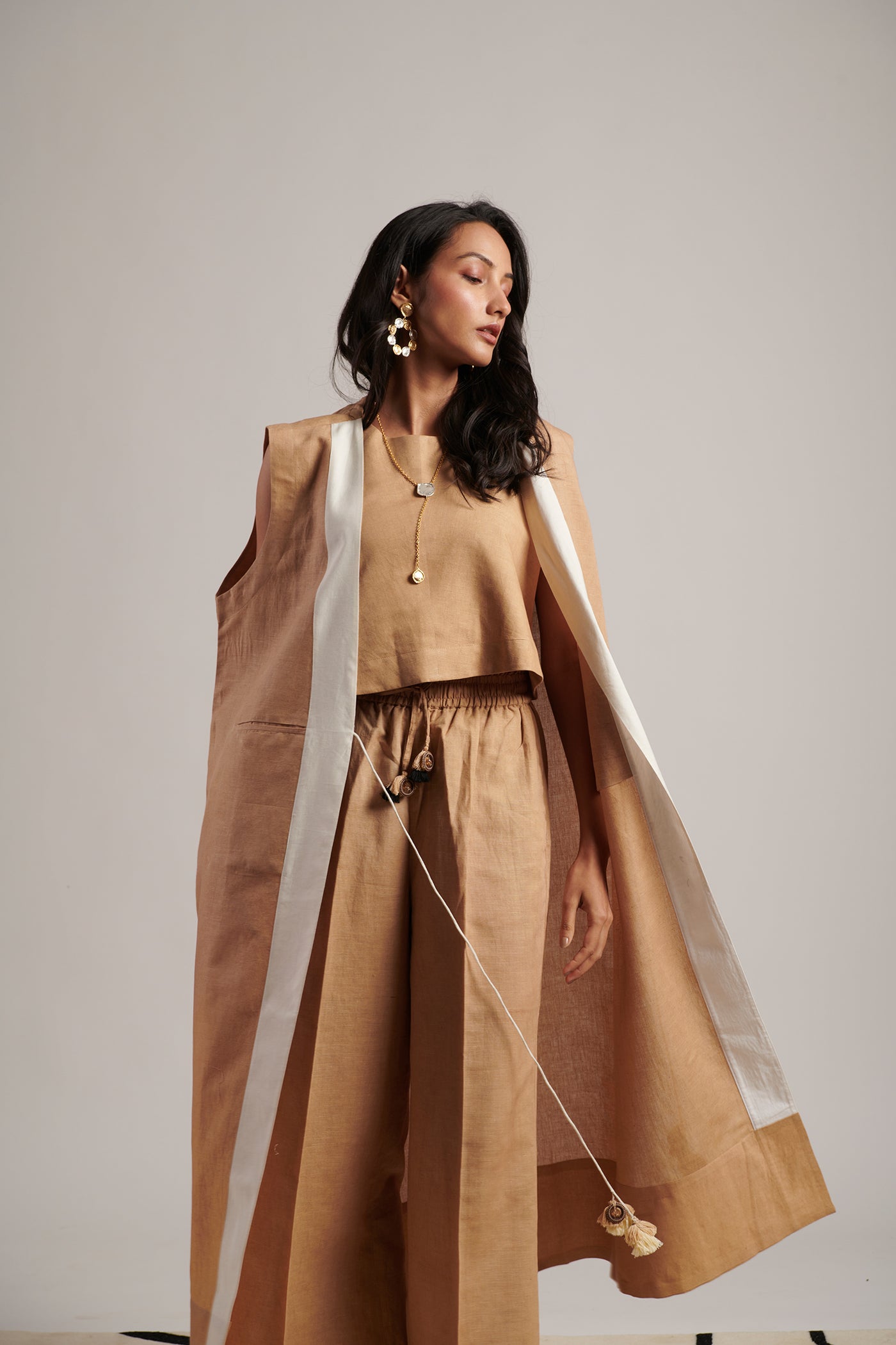 Arrive in time for a fashionably late high tea or maybe even an opera on an evening, you’ll fit right in with our Rooh Co-ord Set yet strikingly stand out. With the most minimal detailing like a tassel tie-up and contrasting front panel on the overlay and a super easy trouser, there’s an innate multiplicity in its persona that delivers high style impact, making it easy to move from event to the other and from one look to another.