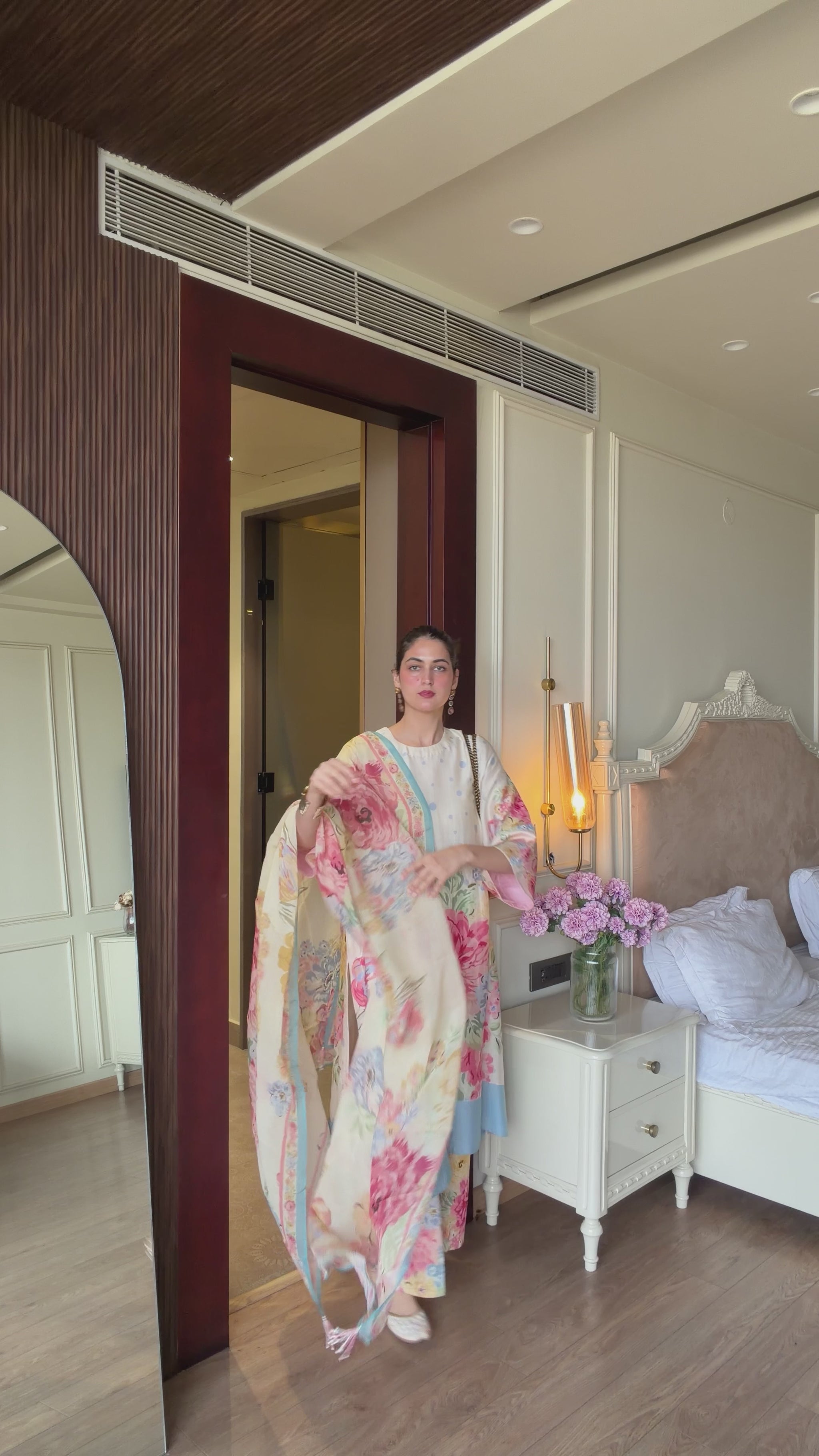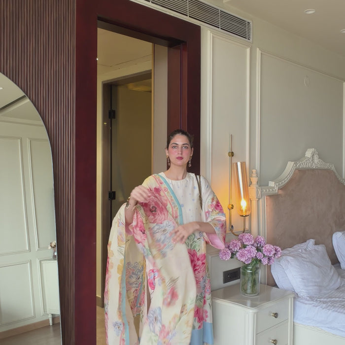 The Rose Mahal Kurta Set draws inspiration from the regal elegance of women through history—graceful, poised, and effortlessly radiant.Crafted from pure chanderi silk, the kurta features a soft ivory base gently kissed with sky blue accents, evoking the delicate murals and floral motifs of ancient palaces. Its A-line silhouette nods to classic tailoring, offering freedom of movement with a structured yet fluid drape. The look is elevated with a pure organza dupatta, light as air and ethereal in feel—echoing the sheer veils worn by women of nobility as both adornment and power. A soft cotton inner lining ensures all-day ease without compromising elegance.