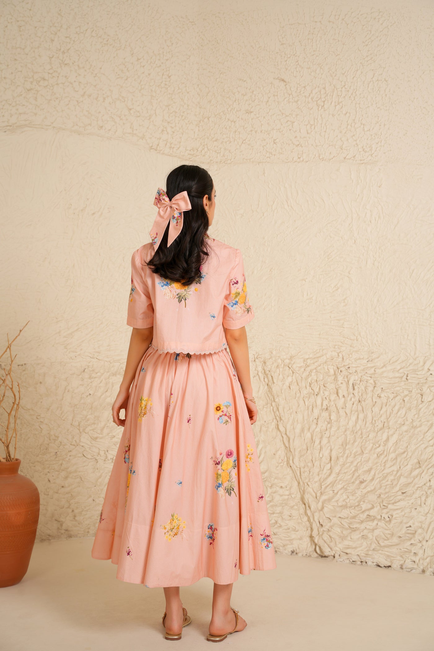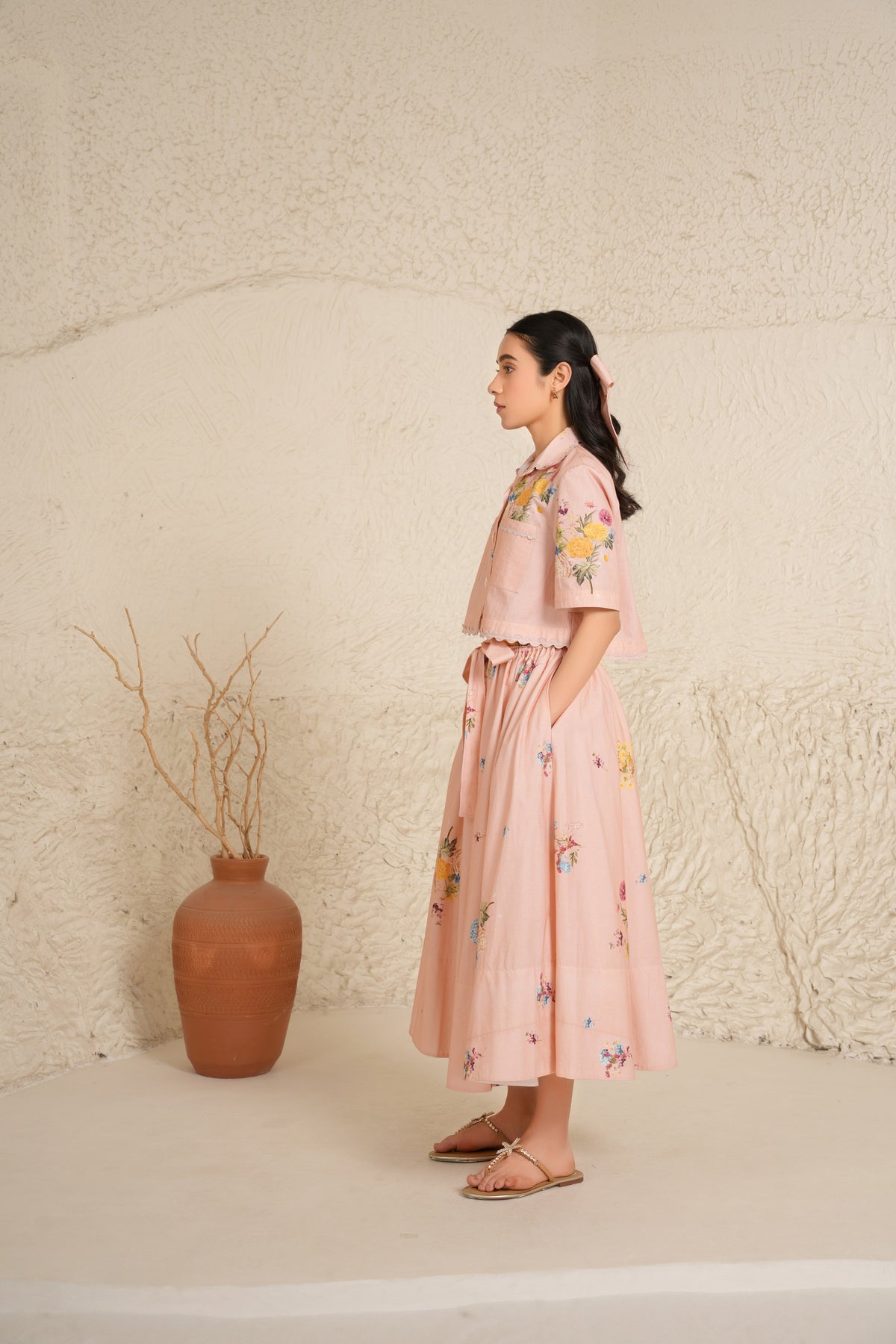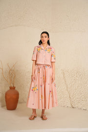 Crafted in soft blush cotton poplin, the long skirt and crop top are adorned with scattered ditsy prints and delicate floral bunches, blending airy romance with structured ease. The ensemble drapes with natural grace, balancing feminine charm and effortless sophistication.
