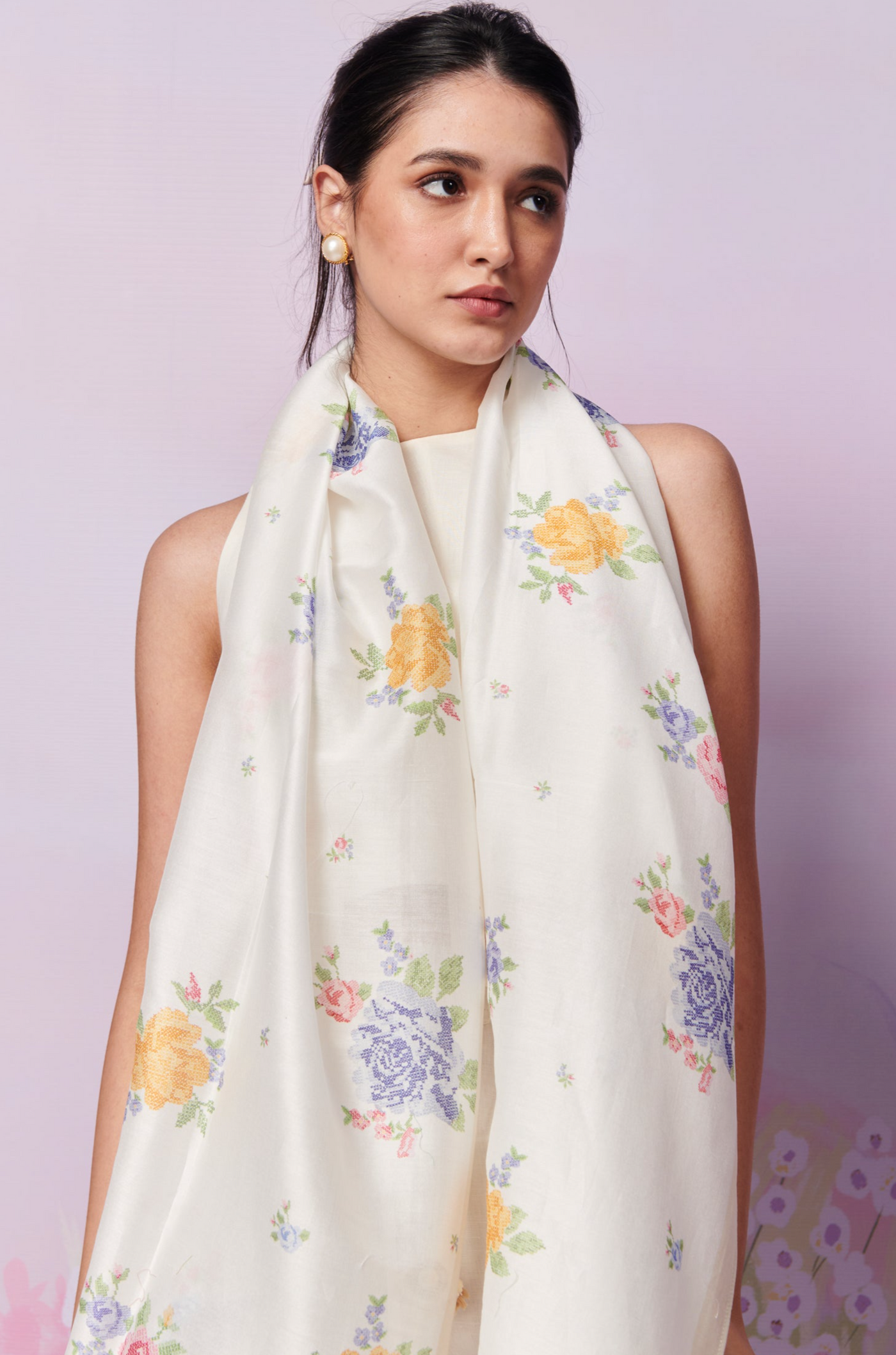 "Introducing the Summer Roses Stole, an exquisite accessory in Chanderi silk. Adorned with delicate white cross-stitch roses, it evokes timeless elegance and charm. Draping effortlessly, this stole adds a touch of refined grace to any ensemble. Embrace the essence of summer's bloom and elevate your style with this luxurious piece.