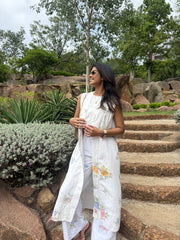 Introducing the Summer Roses Sleeveless Overlay and Trousers Co-ord Set, a harmonious blend of grace and comfort in linen. Delicately adorned with white cross-stitch roses, this set features a sleeveless overlay, crop top, and trousers with pure cotton lining. Enhanced with intricate lace detailing, it epitomizes contemporary elegance for every summer affair.