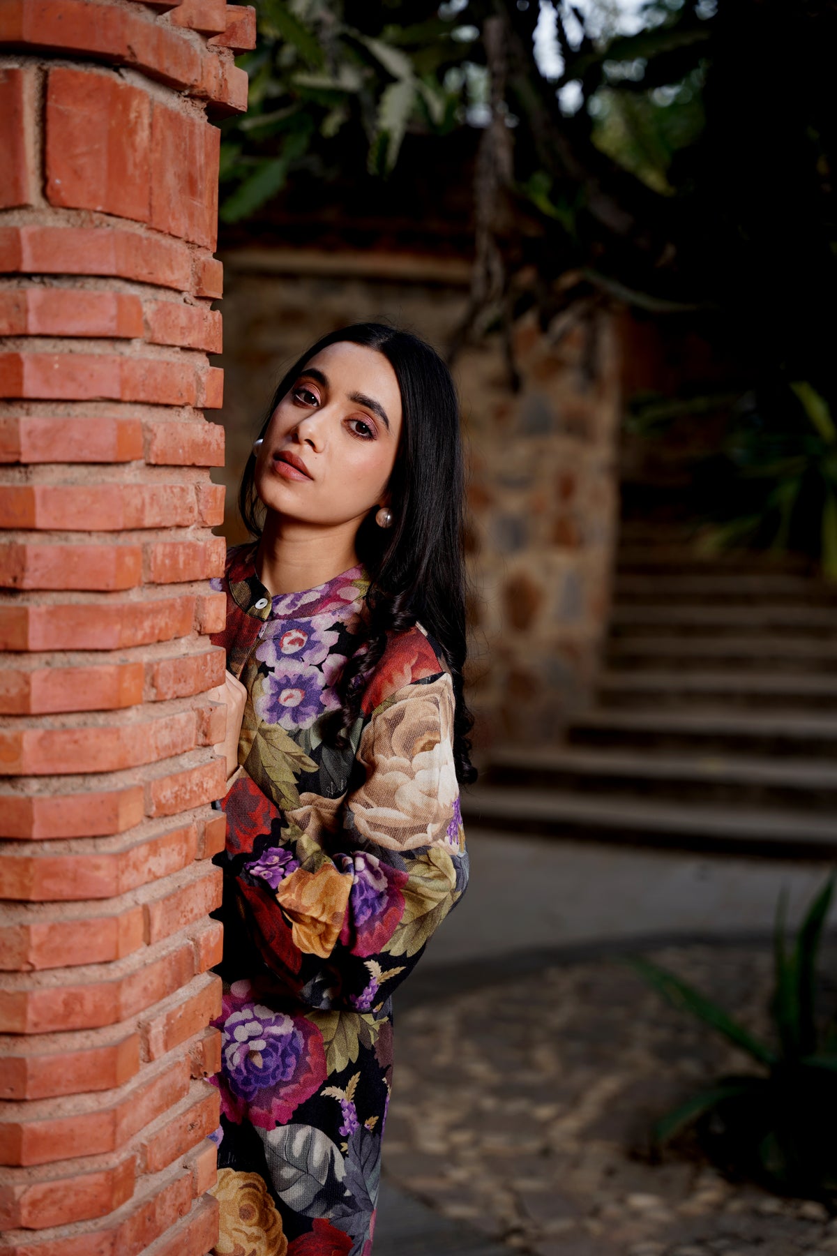 A striking statement piece, the Winter Bloom Dress features all-over bright florals printed on a bold black base, with a textured tapestry effect that adds depth and sophistication. Made from luxurious wool, this dress brings together vibrant florals with a dramatic backdrop, creating a stunning contrast that captures attention. Its flattering silhouette is perfect for elevating any occasion, making it the ultimate combination of bold style, warmth, and elegance. A must-have for those who embrace confident, statement-making fashion.
