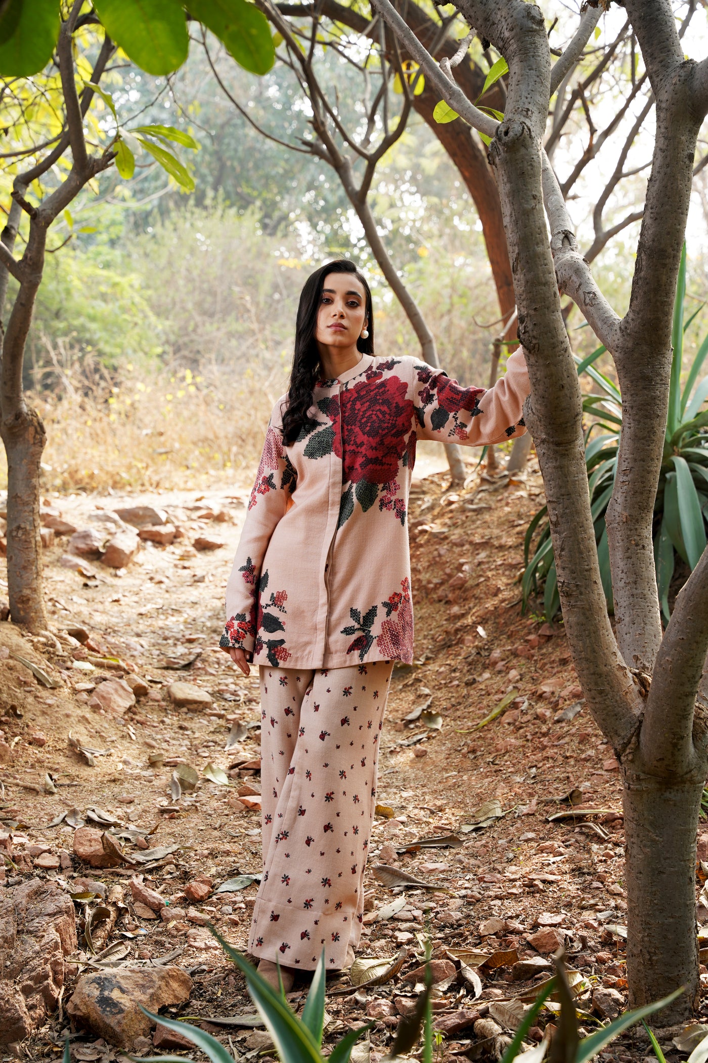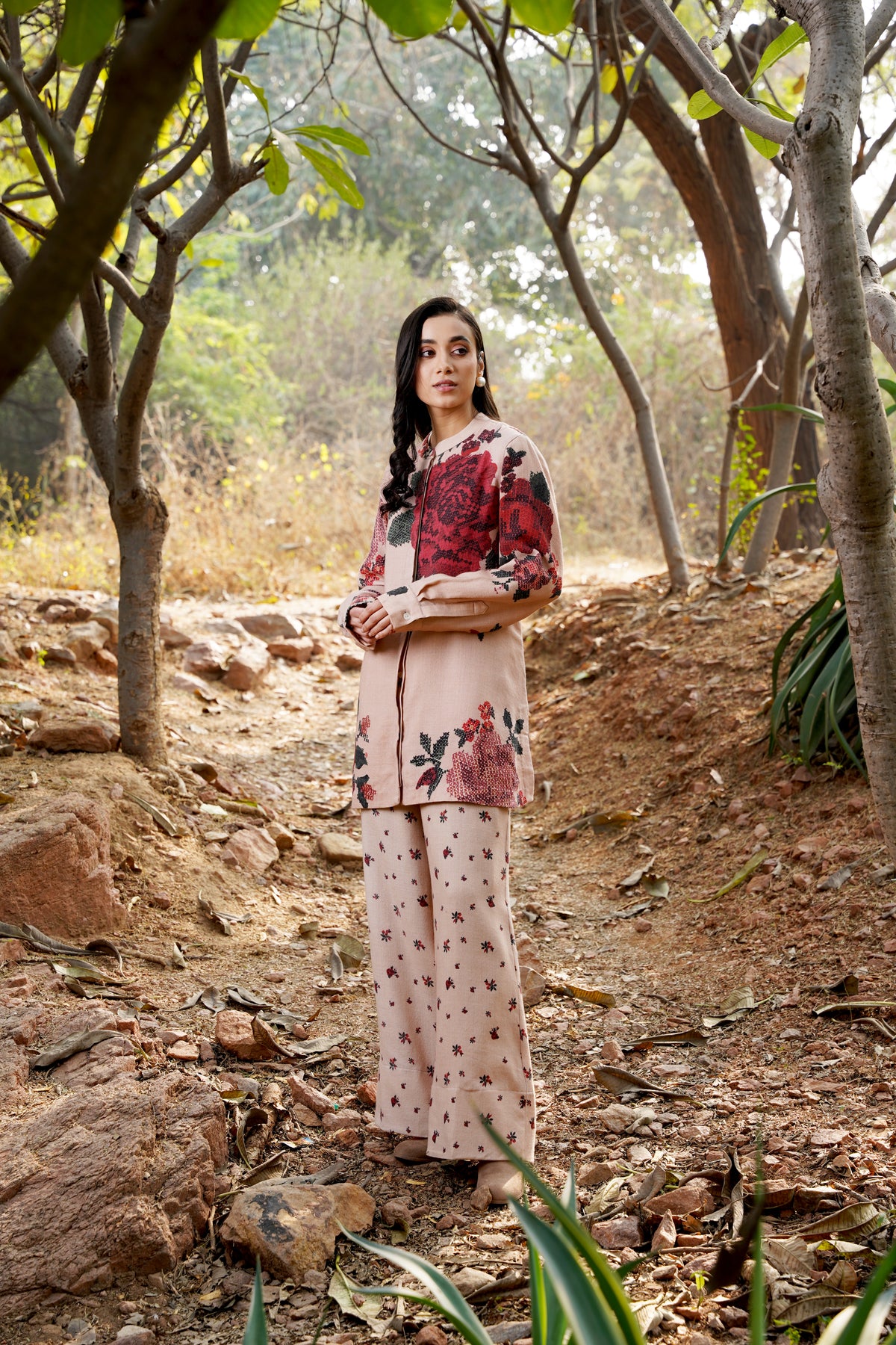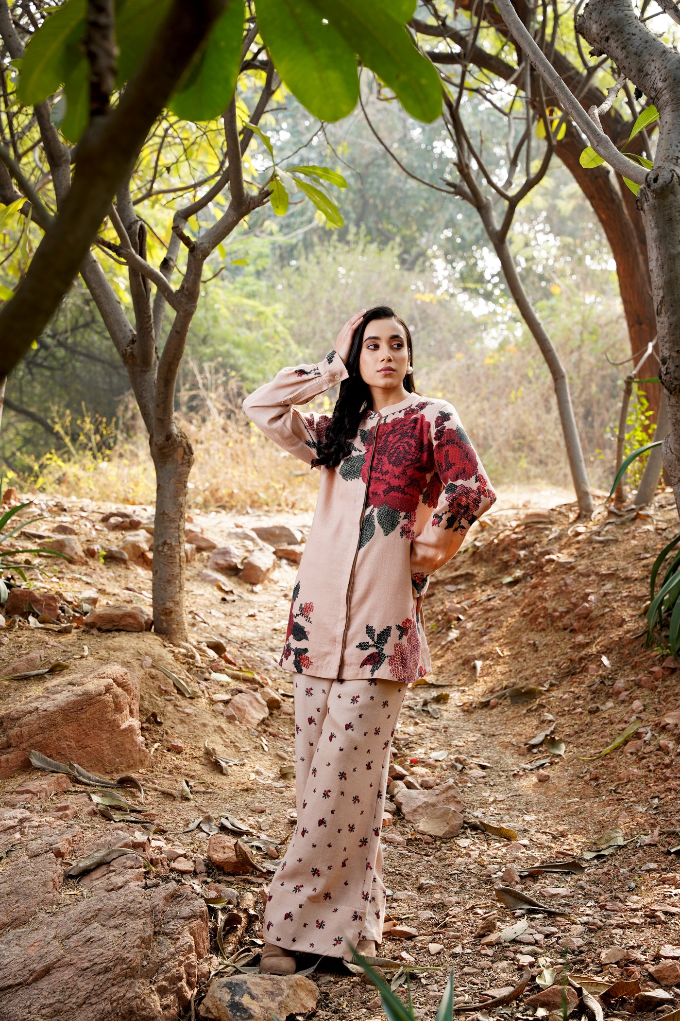 A striking fusion of muted elegance and bold beauty, the Winter Twilight Co-Ord features delicate nude pinks that set the stage for the captivating Darjeeling Red Roses in full bloom. This statement piece captures the essence of winter's subtle warmth, with its understated yet vibrant color palette that celebrates the glory of florals in their most refined form. Perfectly tailored, this co-ord set effortlessly elevates your wardrobe, blending the soft serenity of winter with the vibrancy of nature’s blooms. A modern classic for those who embrace floral sophistication with a touch of boldness.