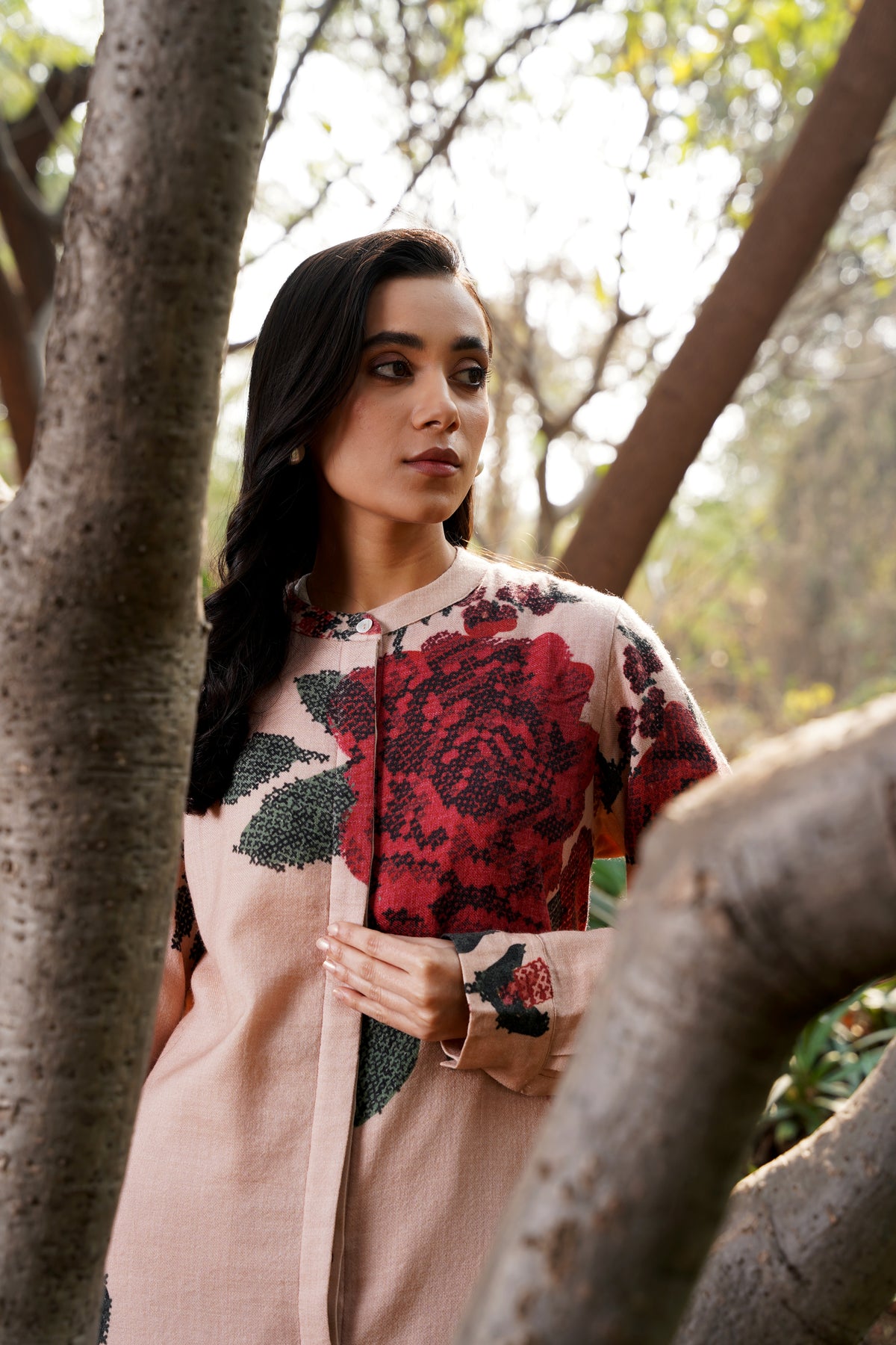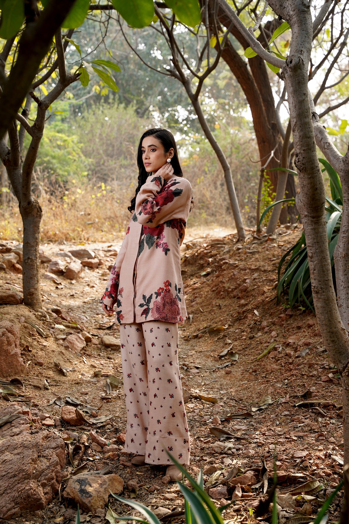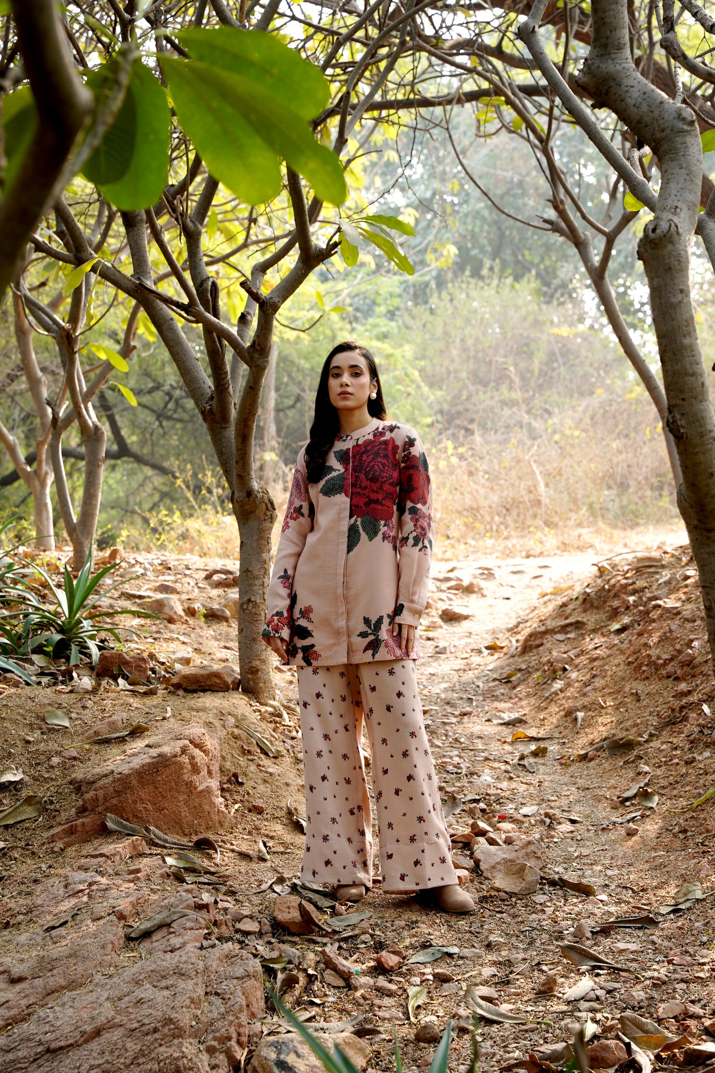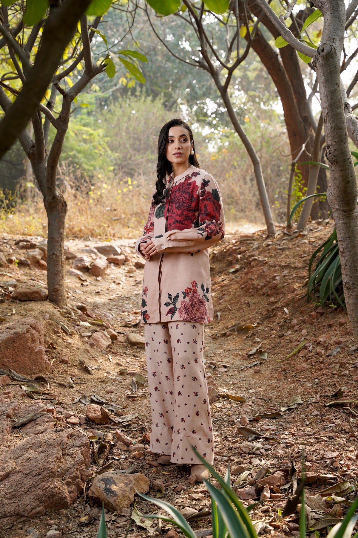 A striking fusion of muted elegance and bold beauty, the Winter Twilight Co-Ord features delicate nude pinks that set the stage for the captivating Darjeeling Red Roses in full bloom. This statement piece captures the essence of winter's subtle warmth, with its understated yet vibrant color palette that celebrates the glory of florals in their most refined form. Perfectly tailored, this co-ord set effortlessly elevates your wardrobe, blending the soft serenity of winter with the vibrancy of nature’s blooms. A modern classic for those who embrace floral sophistication with a touch of boldness.